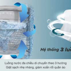 Với lực đẩy cực mạnh từ hệ thống 3 luồng nước tác động, quần áo sẽ luôn được ngập trong bột giặt, từ đó tăng độ thẩm thấu của chất giặt tẩy vào sâu trong từng sợi vải để làm sạch tối ưu, hạn chế việc quần áo bị nhăn nhúm và xoắn rối, tiết kiệm thời gian là ủi.